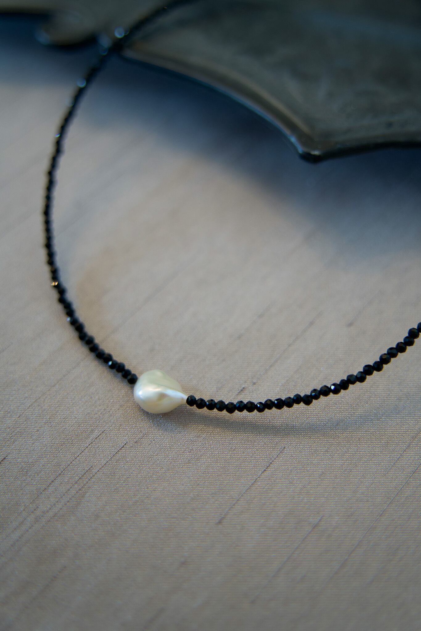 2mmの小さなオニキスと個性的なバロックパールを合わせたネックレスです